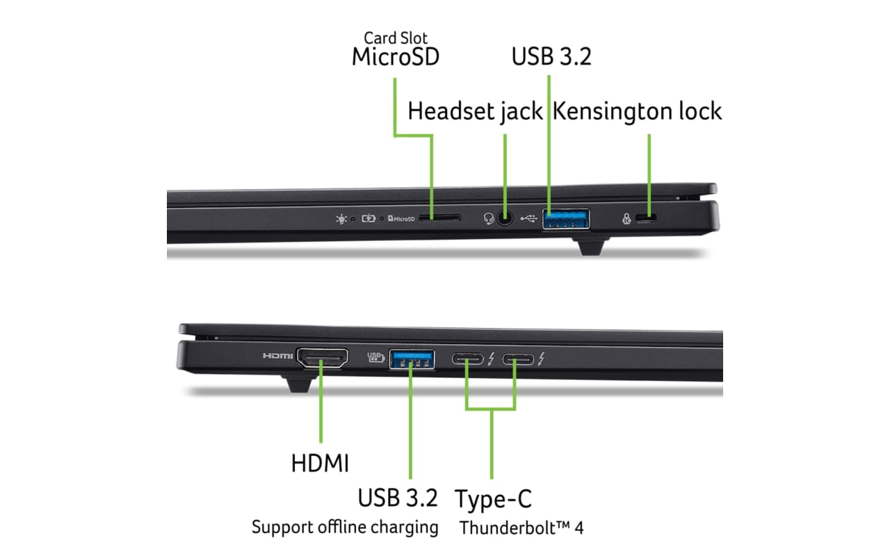 - 2 x USB Type-C (USB4® 40Gbps, Thunderbolt 4, USB charging 5 V; 3 A, DC-in port 20 V; 65-100 W) - 2 x USB-A (3.2 Gen 1, 1 x Power off charging) - 1 x HDMI®2.1 - 1 x microSD kártyaolvasó - 1x 3.5mm jack audio/mikrofon kombinált csatlakozó