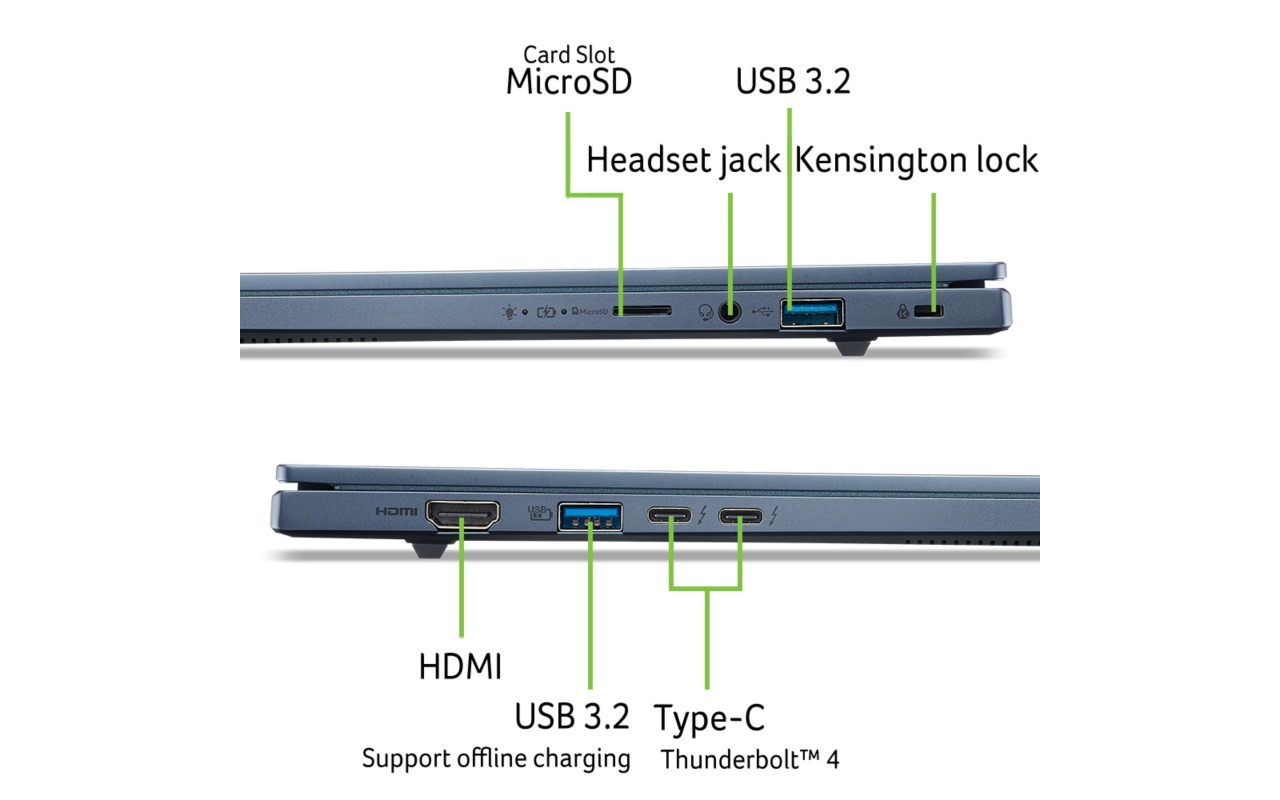 Az SFG14 alumínium készülékházában már a legújabb generációs Intel® Core™ Ultra processzor dolgozik, bőséges LPDDR5X memóriával megspékelve, villámgyors PCIe Gen4 NVMe SSD meghajtóval karöltve.