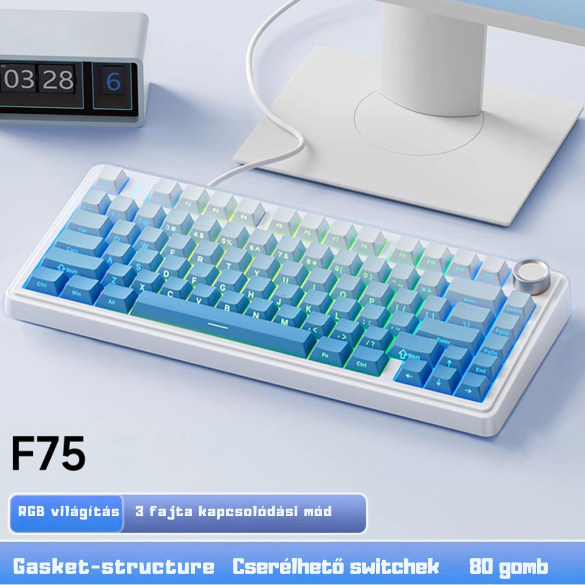 Élvezd az F75 RGB háttérvilágításának dinamikus fényét, amely 16,8 millió szín gazdag spektrumát mutatja be a személyre szabott gépelési környezet érdekében.