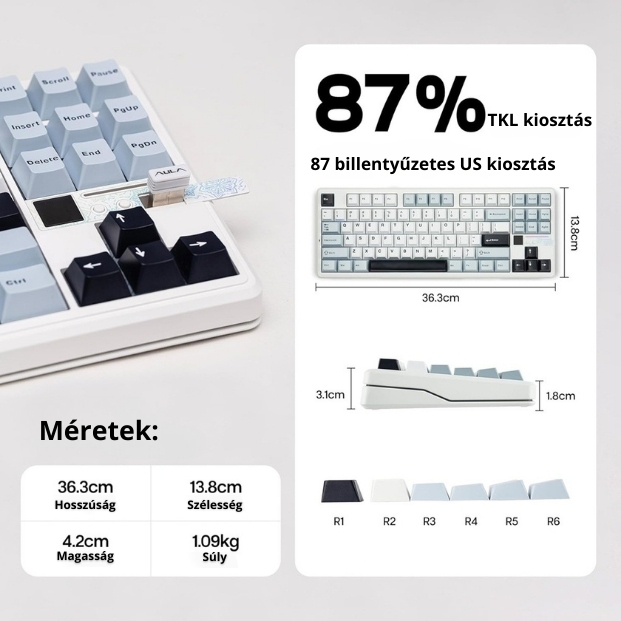 Az AULA F87 PRO V2 egy TKL (Tenkeyless) kialakítású, felsőkategóriás mechanikus billentyűzet, amely tökéletes egyensúlyt teremt a kompakt méret, a professzionális gamer funkciók és a prémium gépelési élmény között. Ideális választás e-sporthoz, gaminghez és irodai használatra is.