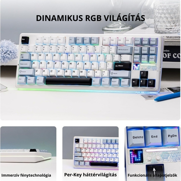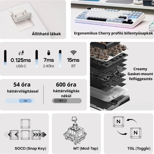 A billentyűzet Bluetooth, 2.4GHz és USB-C vezetékes módot is támogat, így bármilyen eszközhöz könnyedén csatlakoztatható. A beépített 10 000 mAh akkumulátor extrém hosszú üzemidőt biztosít, még intenzív használat mellett is.