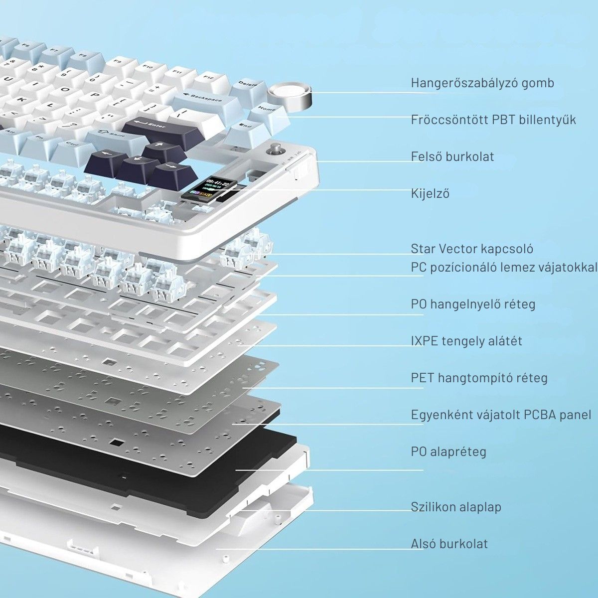 - Három csatlakozási lehetőség (BT, 2,4GHz és USB) - 1,2 mm-es, egykulcsos, préselt NYÁK. - Ötrétegű hang- és ütéselnyelő belső kialakítás. - OEM magasságú, kéttónusú PBT keycap. - Gyári kenésű mechanikus kapcsolók. - RGB világítás - Egyedi LEOBOG Star Vector Switch - Full-Key Hot-Swap cserélhető aljzatok. - Multimédiás hangerőszabályzó. - Testreszabható beépített LCD kijelző - Finomhangolt stabilizátorok.