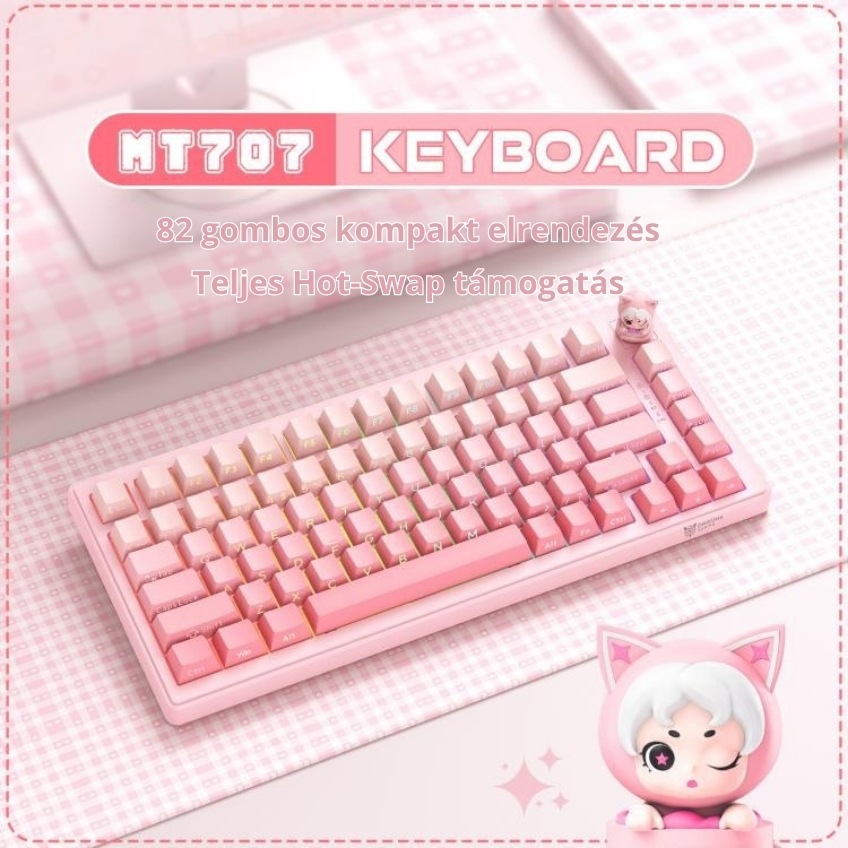 Az MT707 egyik legkülönlegesebb eleme a multimédiás tekerőgomb, amellyel gyorsan állíthatod a hangerőt vagy vezérelheted a médiát. A csomagban található egy cicás (Creative Doll Knob) cserélhető gomb is, amellyel még egyedibbé és aranyosabbá teheted a billentyűzeted megjelenését.