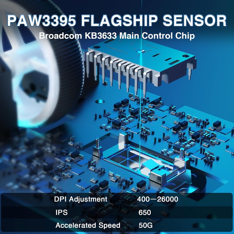 - PAW3395 nagy pontosságú, felsőkategóriás optikai szenzor