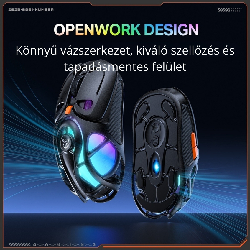 Az innovatív, nyitott (openwork) méhsejt szerkezet nemcsak modern megjelenést kölcsönöz az egérnek, hanem jelentősen javítja a szellőzést is. Ez segít megelőzni az izzadást, így az egér hosszú, intenzív játékmenetek során is hűvös és stabil fogást biztosít.