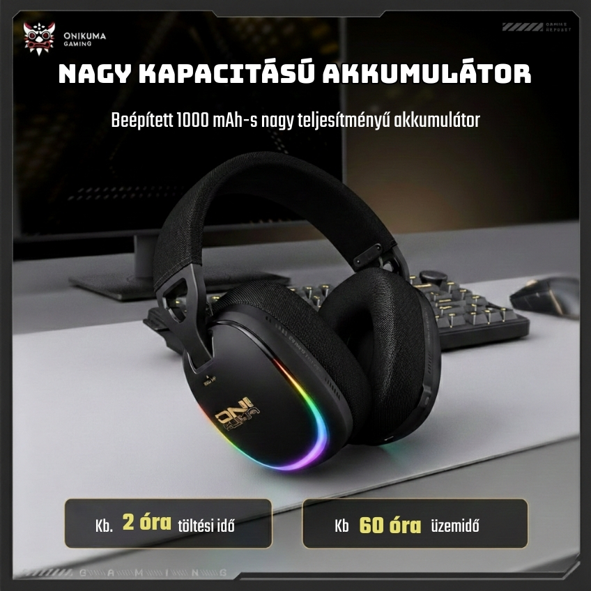 A 1000 mAh kapacitású akkumulátor akár 60 óra használatot biztosít egyetlen feltöltéssel – ideális hosszú gaming maratonokhoz vagy utazáshoz.