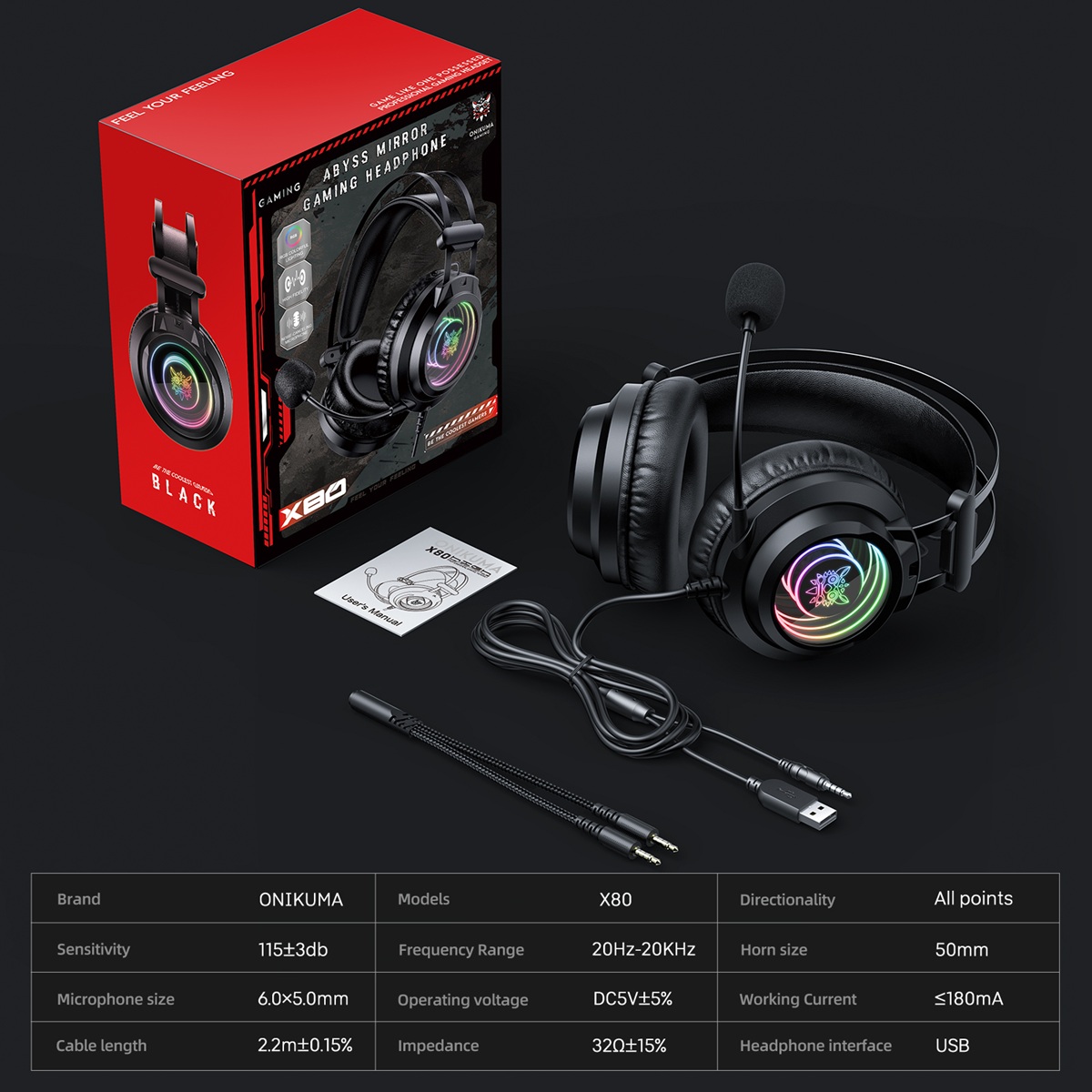 Onikuma X80 Vezetékes Gamer Fejhallgató RGB világítással - Fekete
