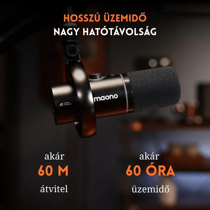 A mikrofon valódi hibrid megoldás: használható 2,4G vezeték nélküli kapcsolattal, vezetékes USB-C csatlakozáson keresztül, illetve XLR kimenettel is, így könnyedén illeszthető otthoni vagy stúdiókörnyezetbe. A vezeték nélküli hatótáv akár 60 méter, az üzemidő pedig körülbelül 60 óra, ami maximális szabadságot és megbízhatóságot biztosít hosszabb felvételek során is.
