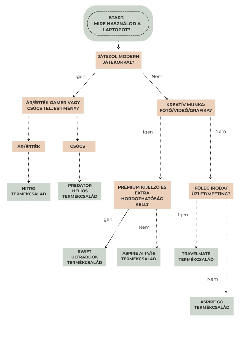 Ha nem szeretnél hosszasan specifikációkat összehasonlítani, az alábbi mini döntési fa segít néhány egyszerű kérdésen keresztül megtalálni a számodra ideális Acer laptopcsaládot.
