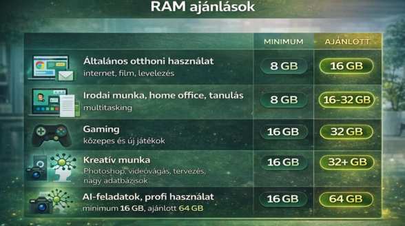 - ha fontos, hogy videóhívások és nagy dokumentumok mellett is stabil maradjon a rendszer - Gaming: közepes és új játékok: minimum 16 GB, ajánlott 32 GB